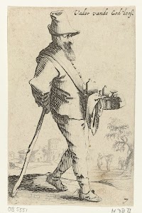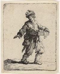 Marskramer leunend op een stok