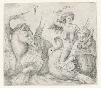 Oude vrouw op rug van triton naast…