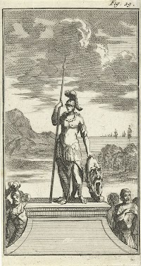 Gewapende amazone steunend op een…