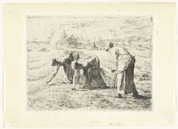 Drie vrouwen lezen aren op akker