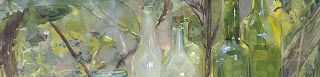 Vensterbank met flessen, een glazen…
