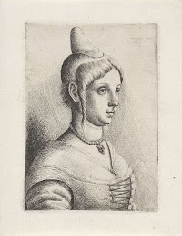 Vrouwfiguur met mutsje en opstaande…