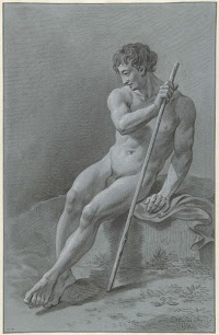 Zittend mannelijk naakt, een staf…